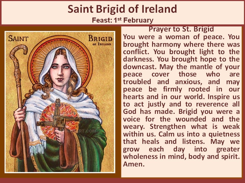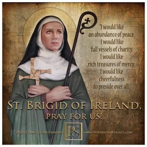 February 1, we celebrate the feast of Saint Brigid of Ireland (453-523), one of three patron saints of Ireland, alongwith Sts. Patrick and Columba, abbess, apostle of charity and founder of several monasteries of nuns, including that of Kildare in Ireland.