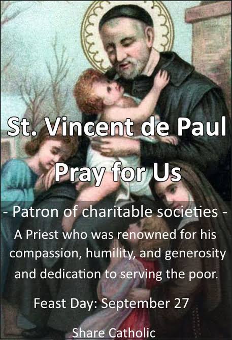 September 27, we celebrate the feast of Saint Vincent de Paul (1581-1660), “Holy Hero/Apostle of Divine Charity,” founder of the Congregation of the Mission, patron of catholic charities, who dedicated himself to serving the poor, renowned for his compassion, humility, and generosity and the patron of all catholic charitable societies.